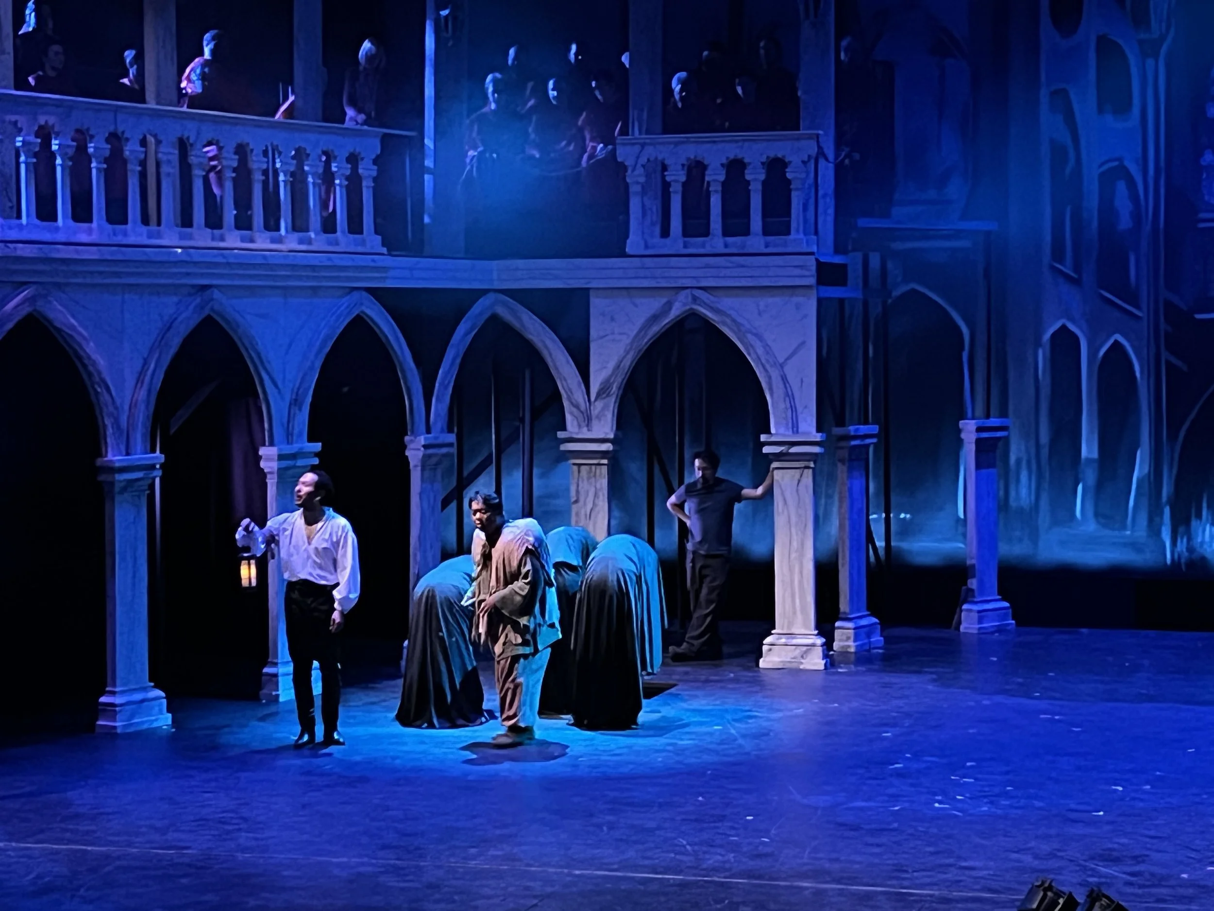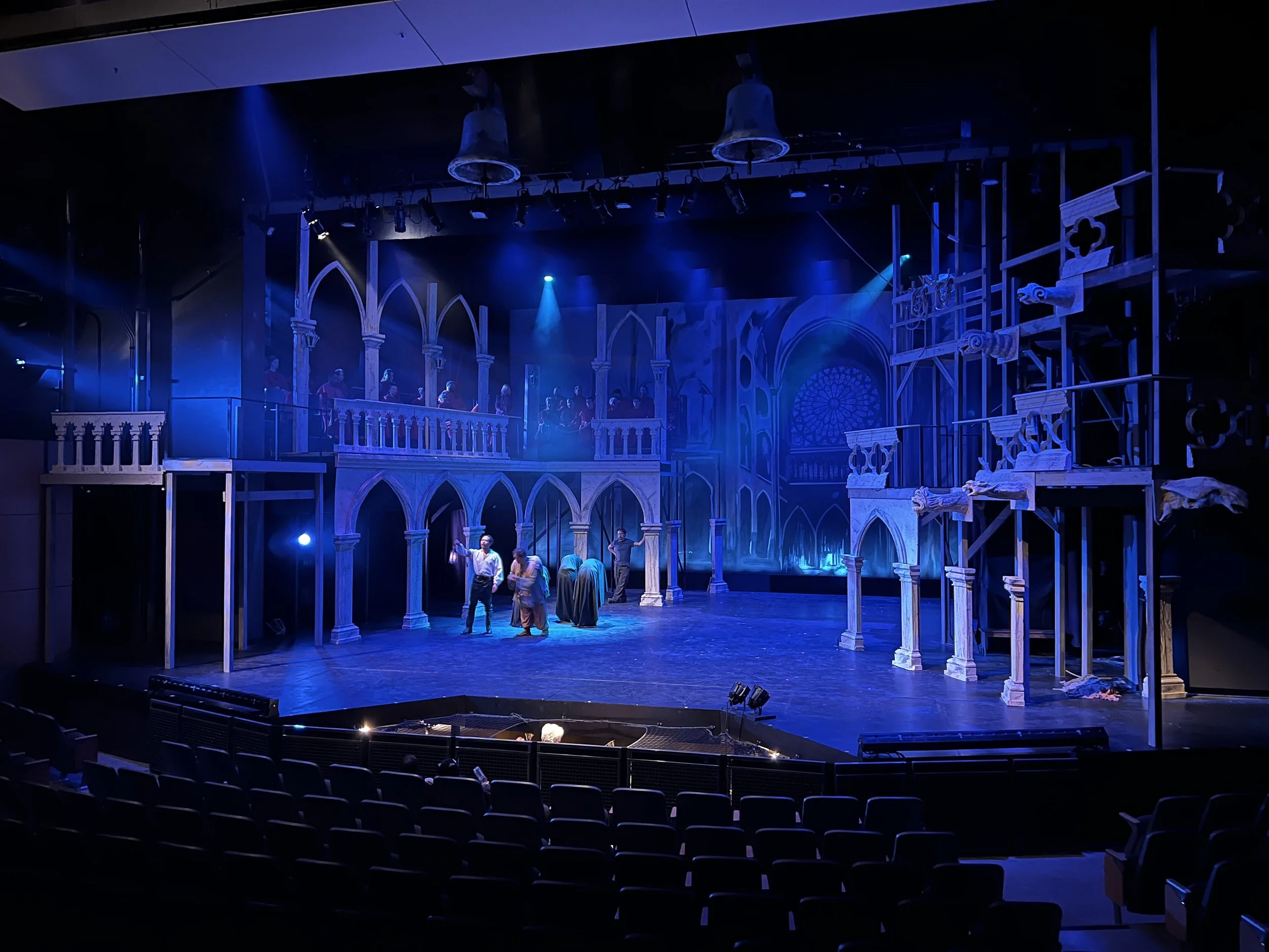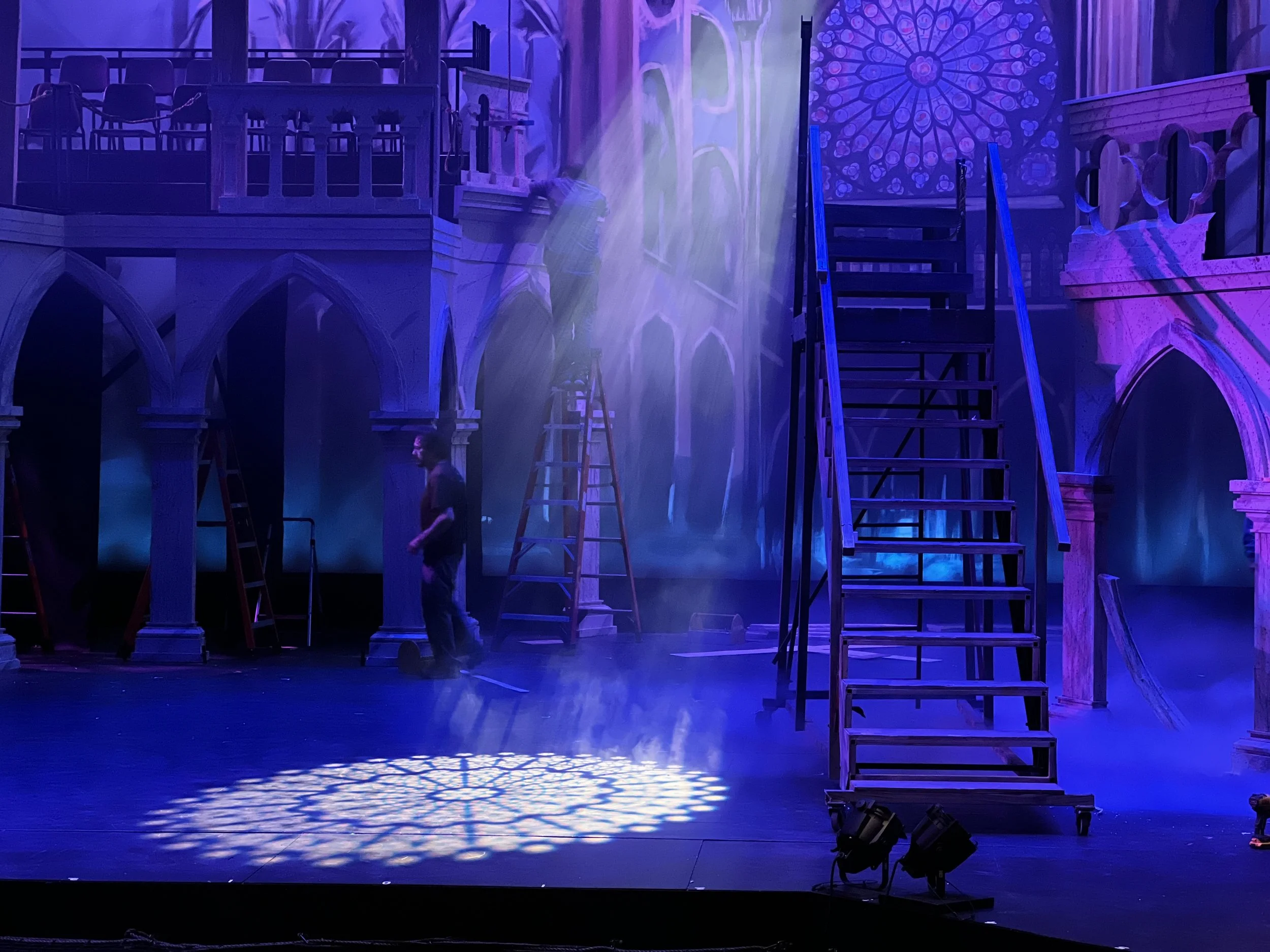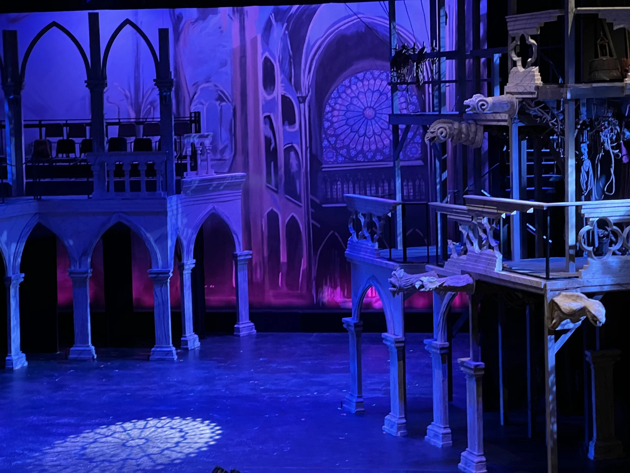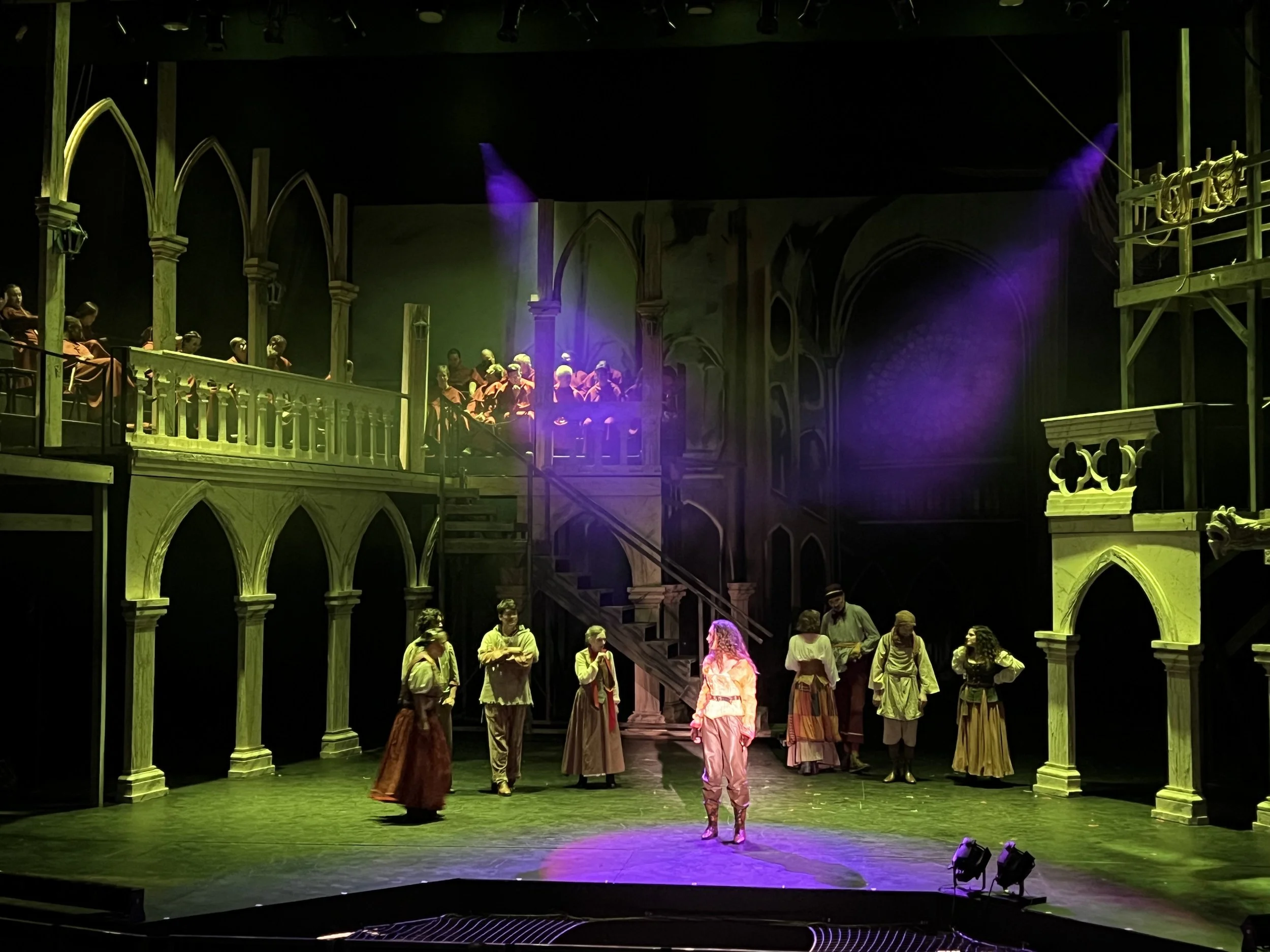 “Lit with a flawless eye by Carina Swanberg, the epic Skip Epperson scenic design serves to move the action from confrontations with touring Romani, into the hallowed cathedral interior and high up into the bell tower where dwells the deaf hunchback Quasimodo (Juan Castro), kept out of sight by his surrogate father, the archdeacon Frollo (David Murphy).”