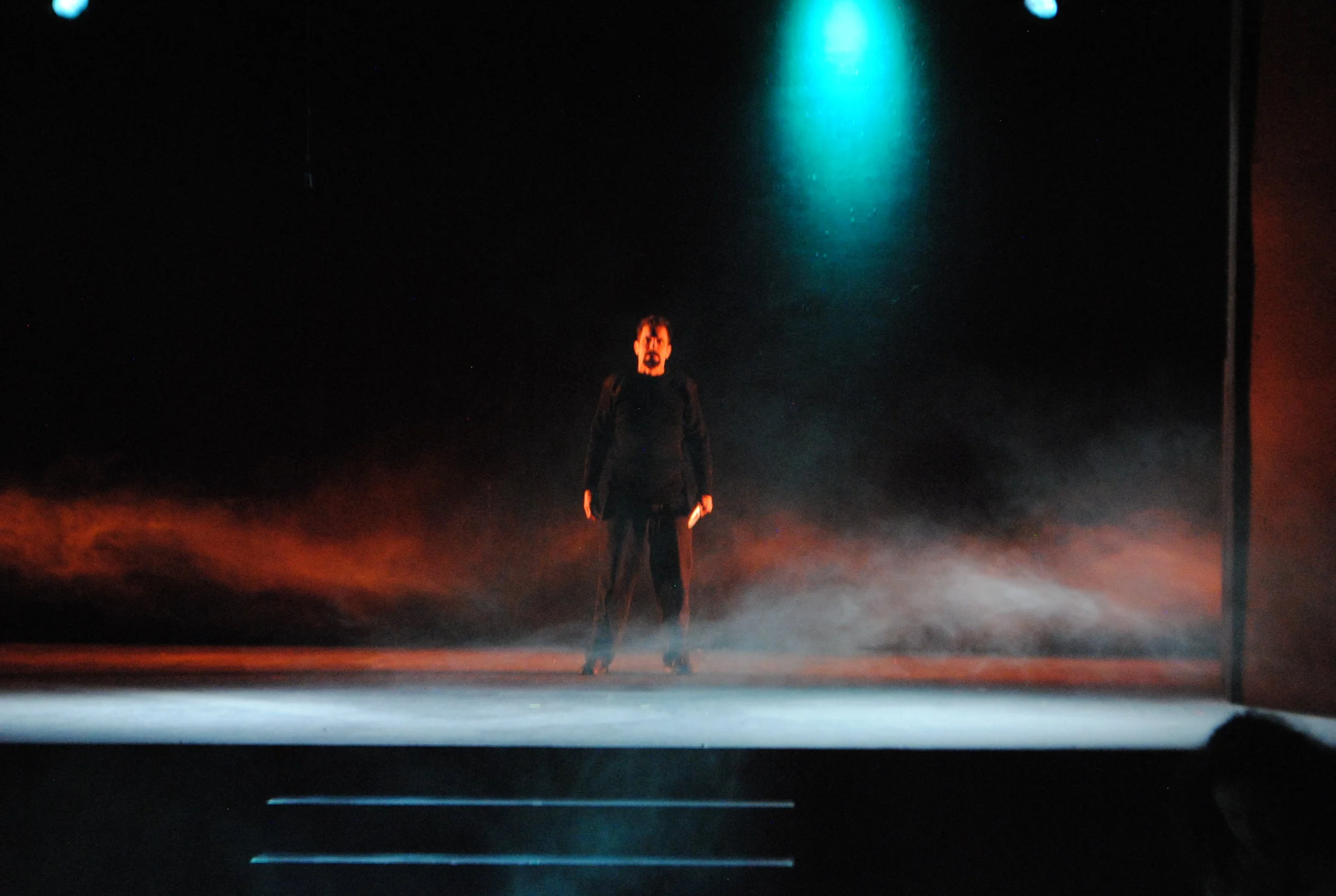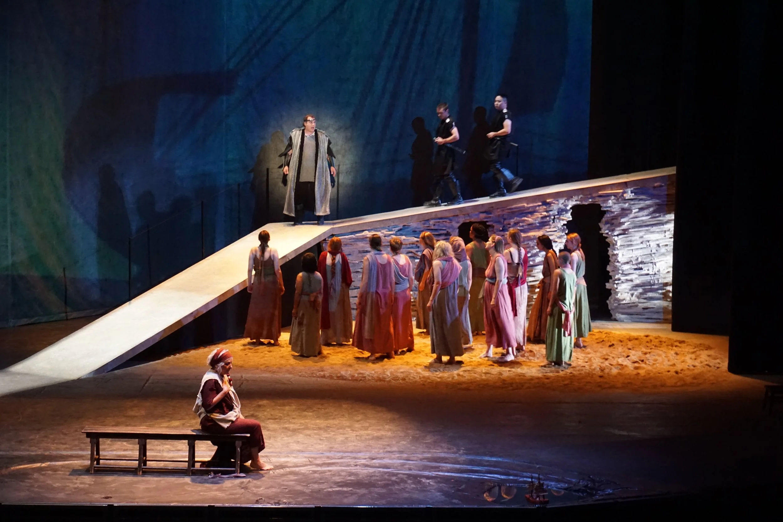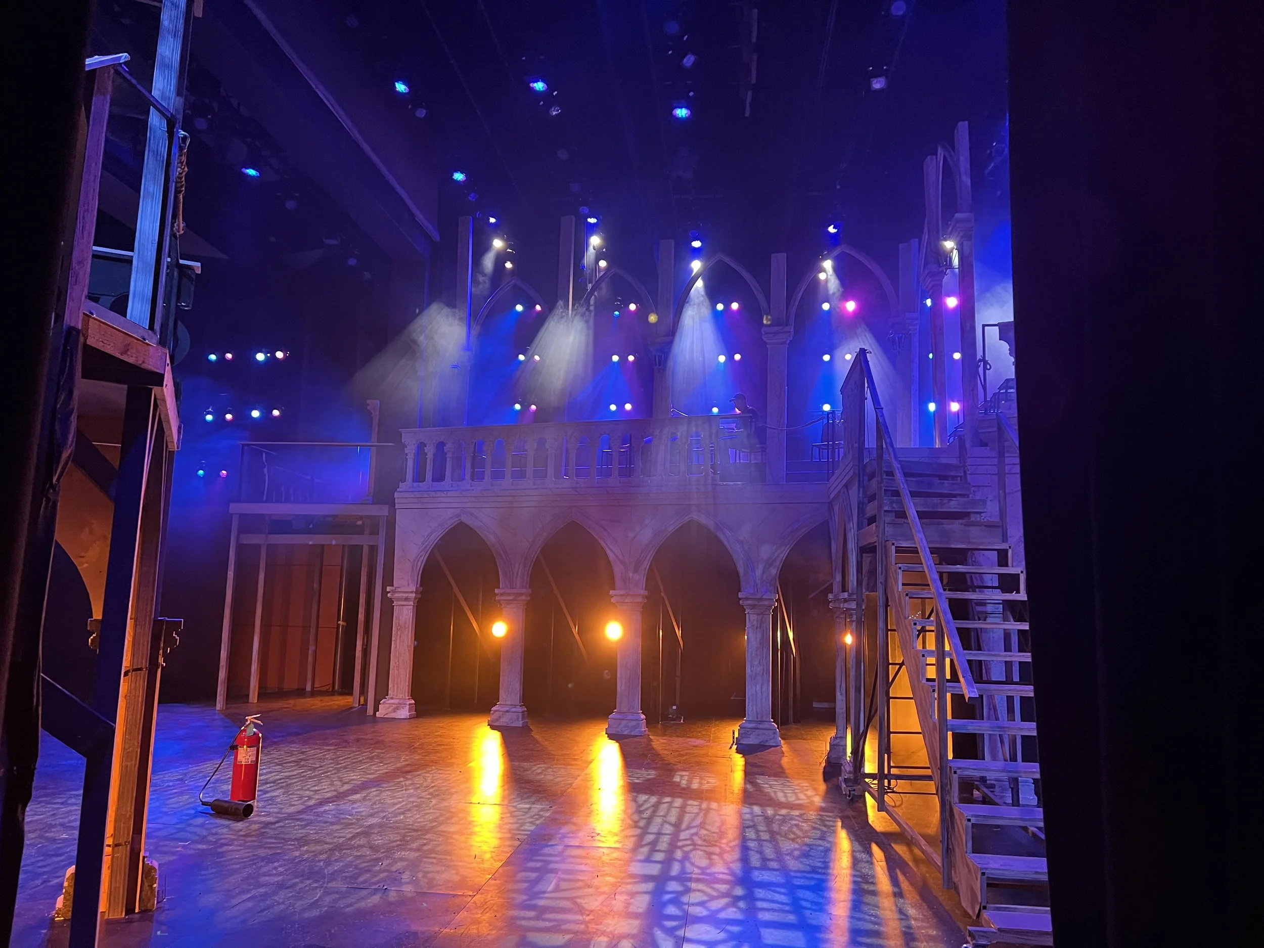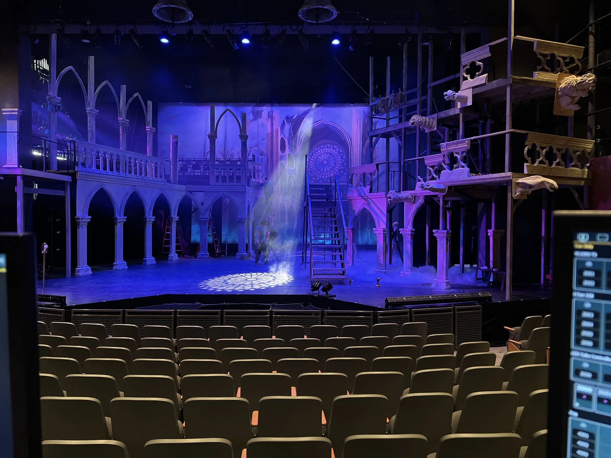 “Lit with a flawless eye by Carina Swanberg, the epic Skip Epperson scenic design serves to move the action from confrontations with touring Romani, into the hallowed cathedral interior and high up into the bell tower where dwells the deaf hunchback Quasimodo (Juan Castro), kept out of sight by his surrogate father, the archdeacon Frollo (David Murphy).”