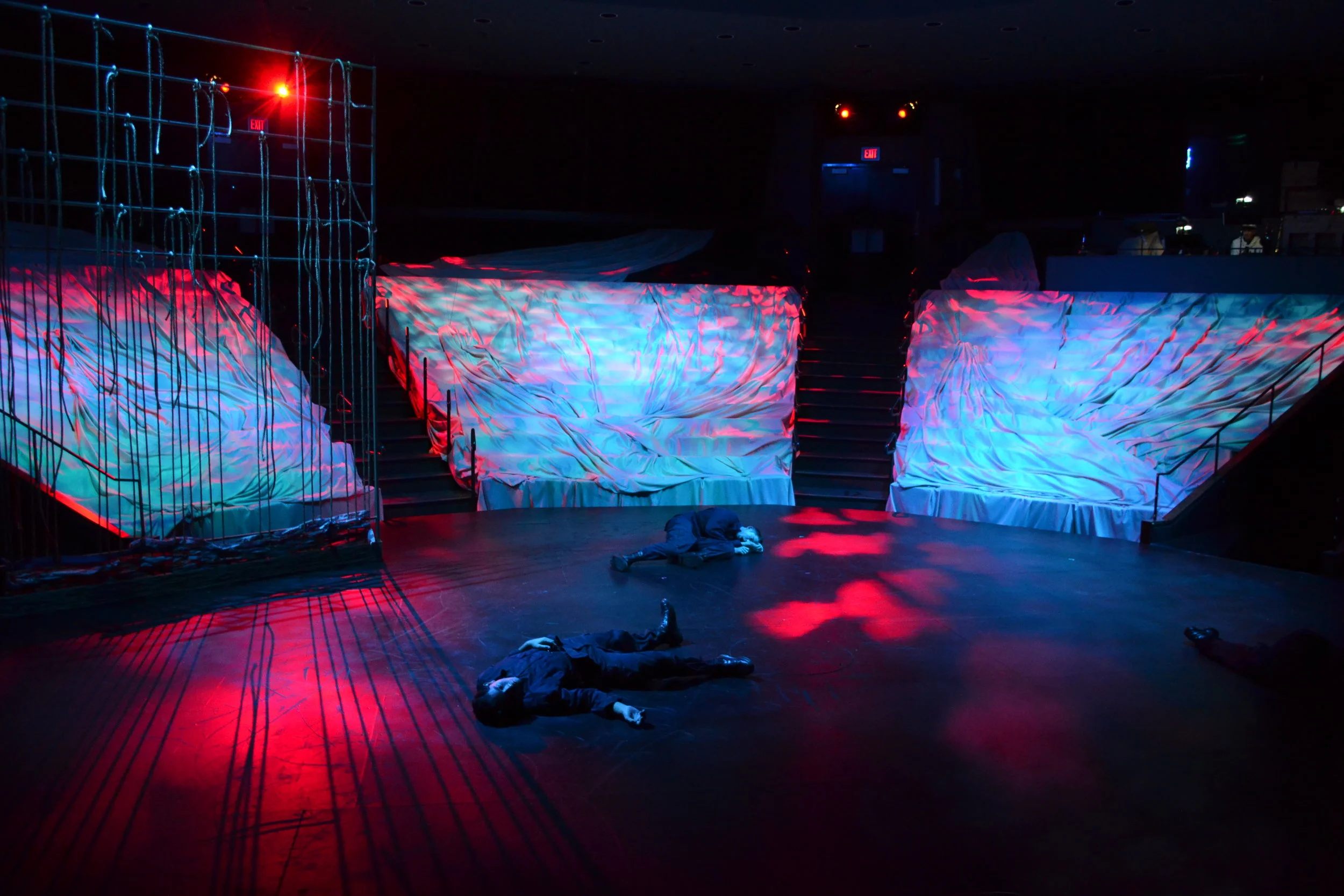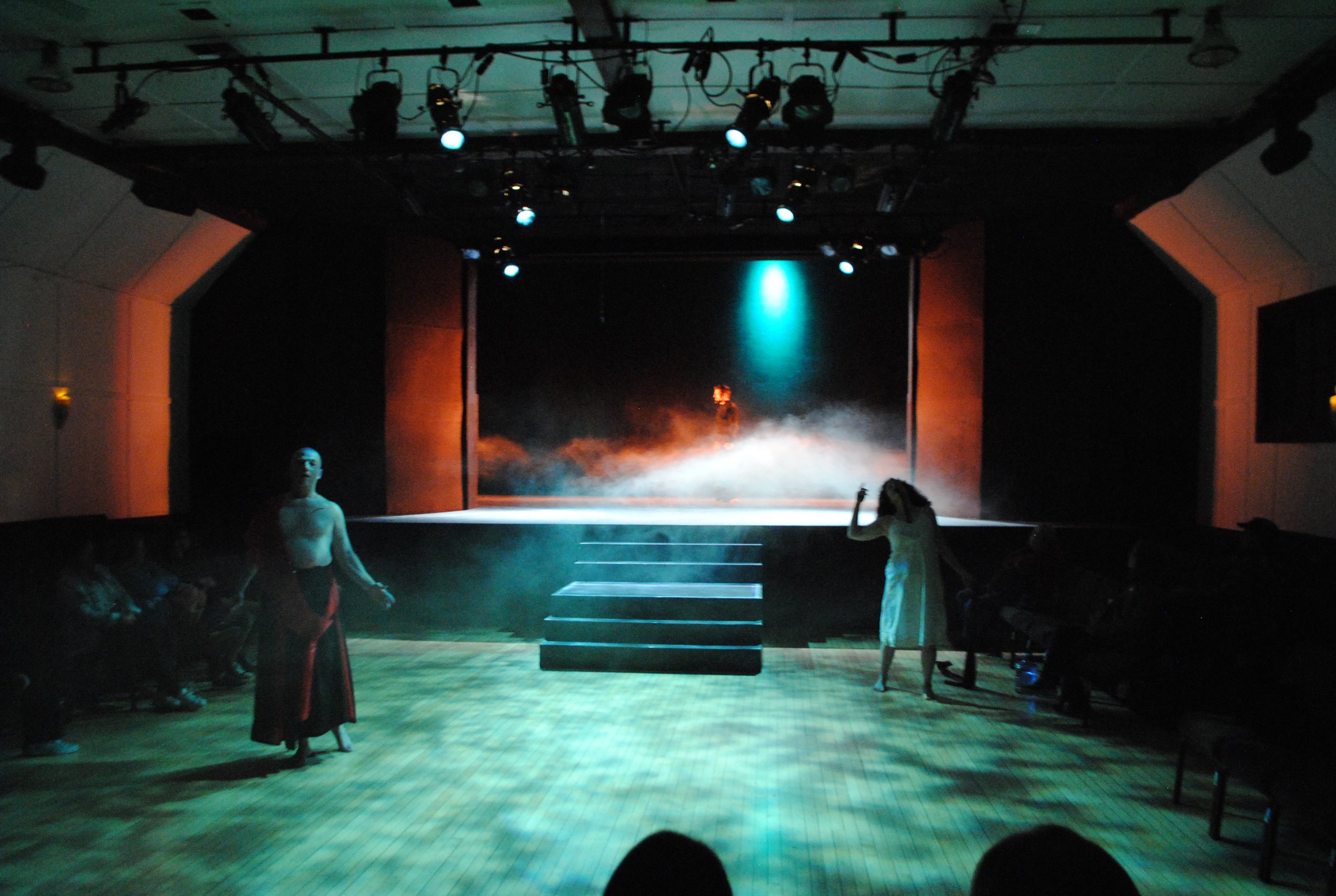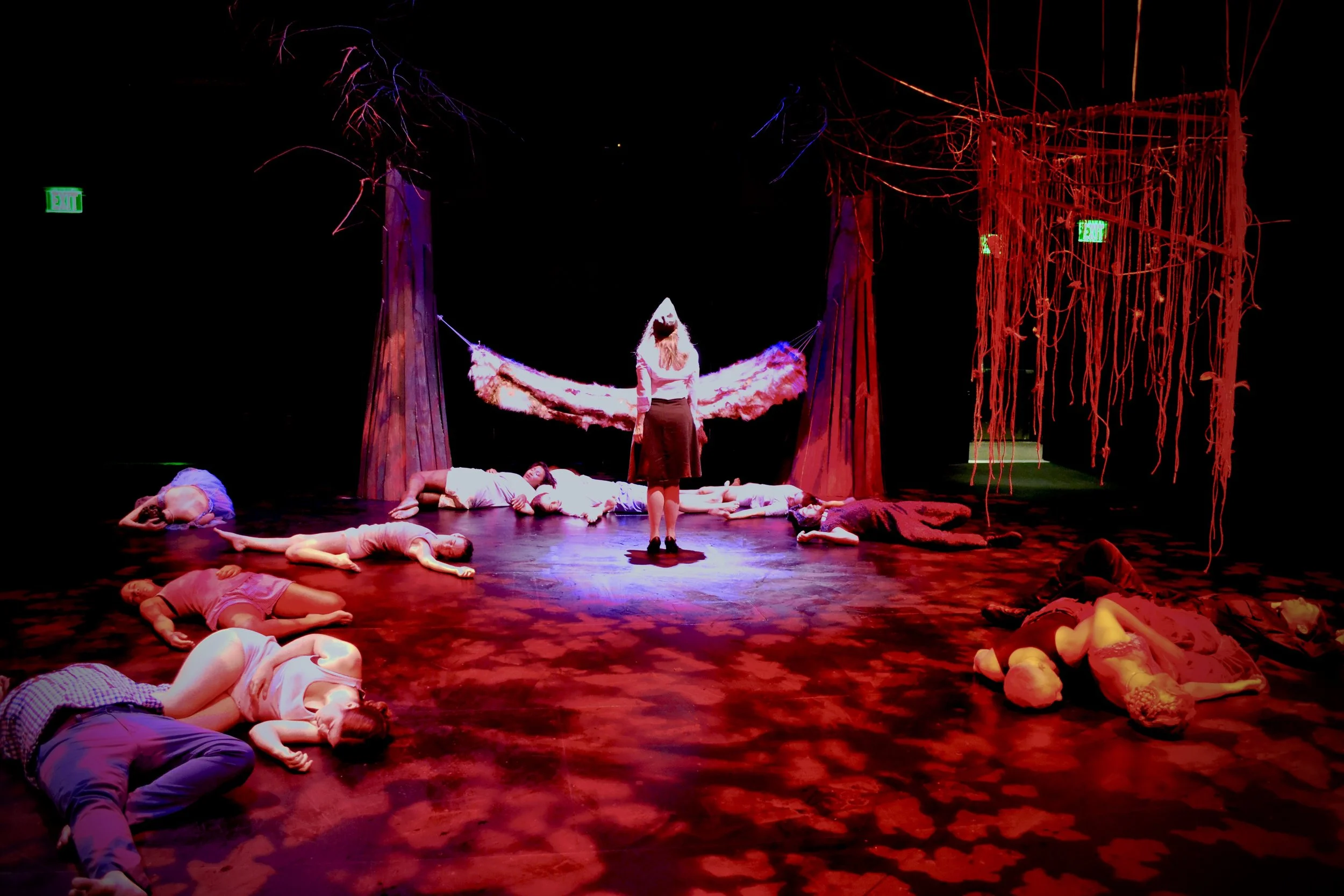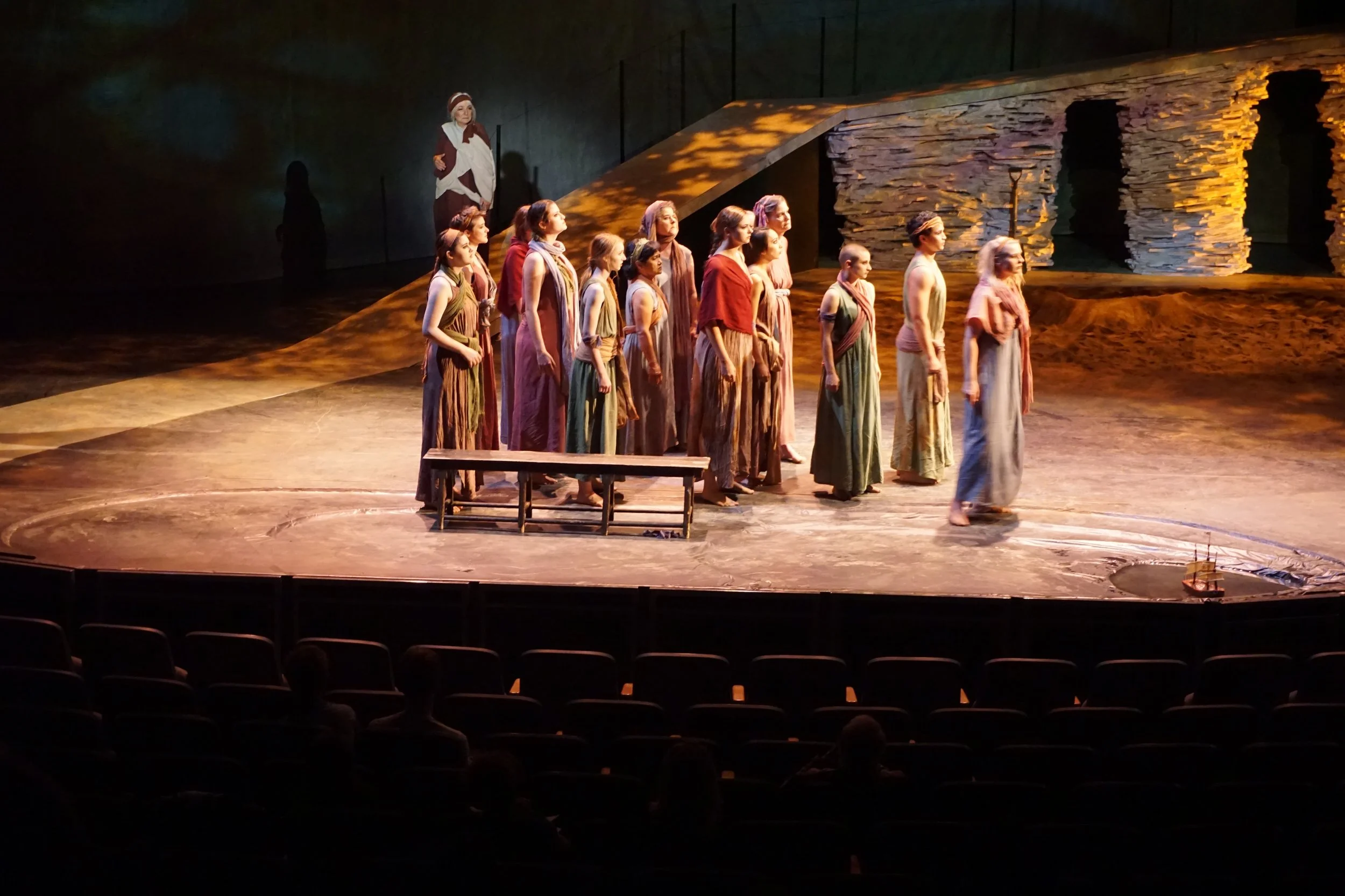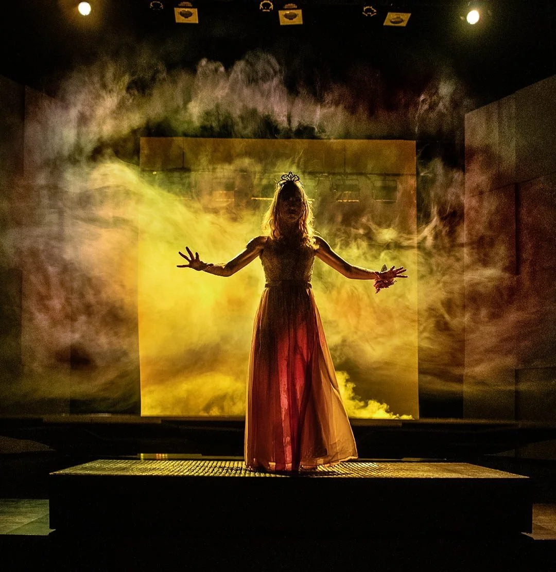 “Lit with a flawless eye by Carina Swanberg, the epic Skip Epperson scenic design serves to move the action from confrontations with touring Romani, into the hallowed cathedral interior and high up into the bell tower where dwells the deaf hunchback Quasimodo (Juan Castro), kept out of sight by his surrogate father, the archdeacon Frollo (David Murphy).”